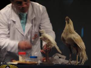Una luz exigua inundaba el espacio central del escenario, que mostraba como telón de fondo la imperecedera imagen de la casa de Norman Bates. A un costado, el músico experimental Toto Álvarez ambientaba la puesta en escena con los sonidos arrancados de su guitarra. En las sombras, la voz de C. Faúndez recreaba fragmentos de “El taller para embalsamar pájaros”, “El diario de Norman Bates” y “La embalsamada”, los capítulos que conforman el cuento “Variaciones…”. Al otro lado del escenario, pulcro e inmutable, un taxidermista daba rienda suelta a su oficio, deshabitando el cuerpo de una paloma blanca e infundiéndole nueva vida hecha de hilos, paja, alambres y algodón.